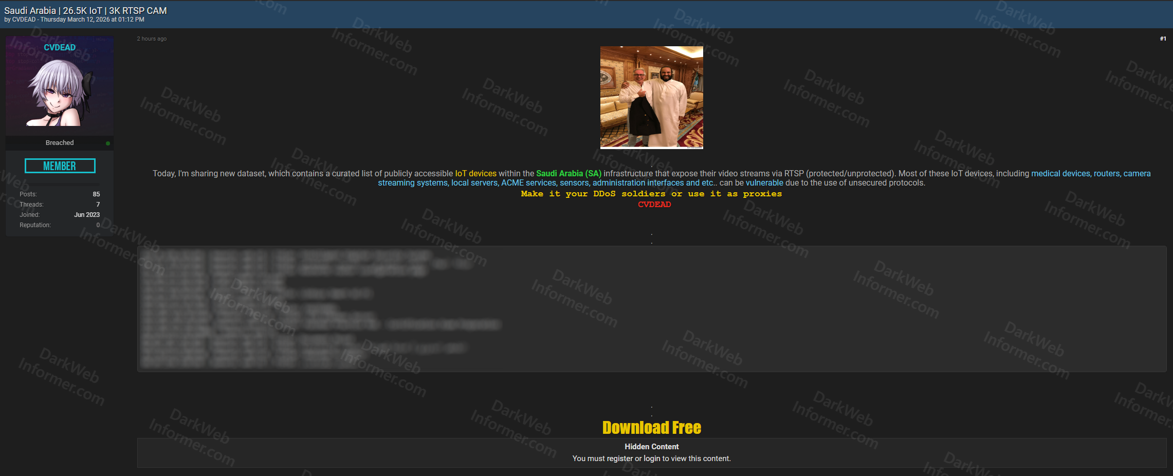 A threat actor using the handle CVDEAD has shared a curated dataset of 26,500 publicly accessible IoT devices and 3,000 RTSP camera streams located within Saudi Arabia's infrastructure. The dataset is being offered as a free download, and the actor explicitly encourages using the exposed devices as DDoS botnet soldiers or as proxies for anonymized traffic routing.