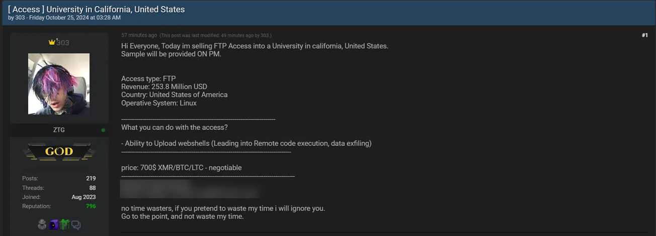 303 Allegedly is Selling Access to an Unidentified California-based University