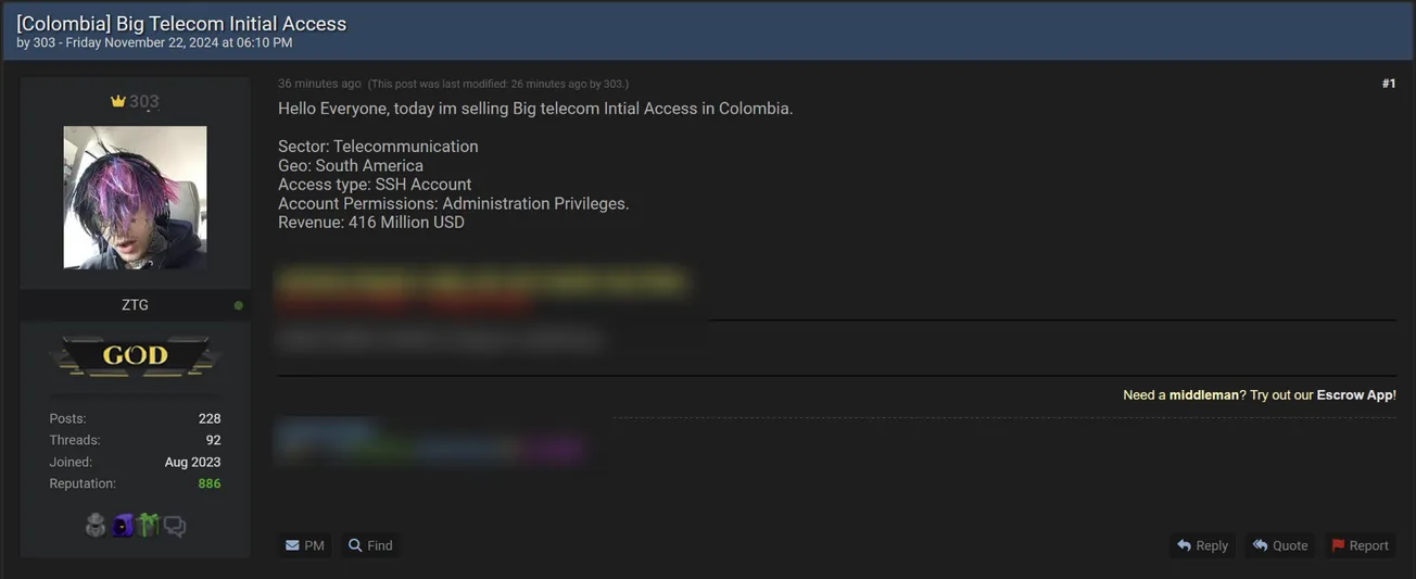 303 is Allegedly Selling SSH Access to an Unidentified Telecom Company in Colombia