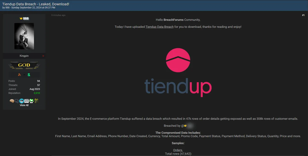🚨 Title: Allegedly leaked Tiendup database