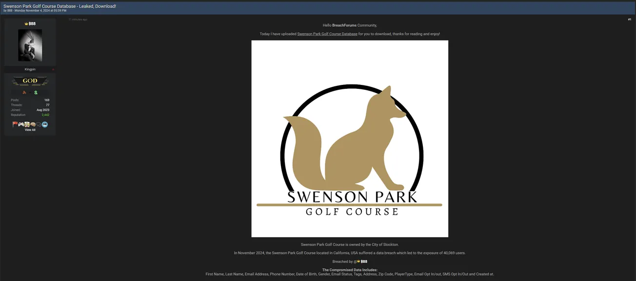 🚨 Title: Alleged database leak of Swenson Park Golf Course