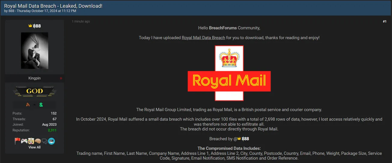 🚨 Title: Database of Royal Mail allegedly leaked