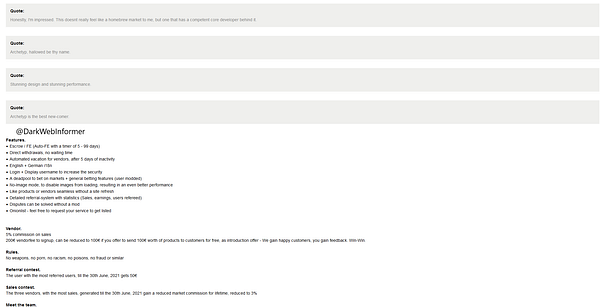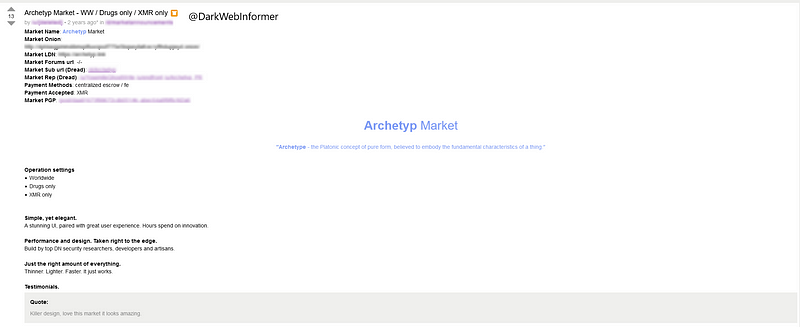 Archetyp Market only accepts XMR crypto and has been active since May 2021. Screenshots are below of their market announcement on Dread.