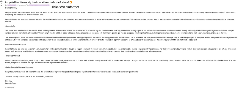 Incognito Market accepts BTC and XMR crypto and has been active since October 2020. Snaps are below for Incognito’s market announcement on Dread.