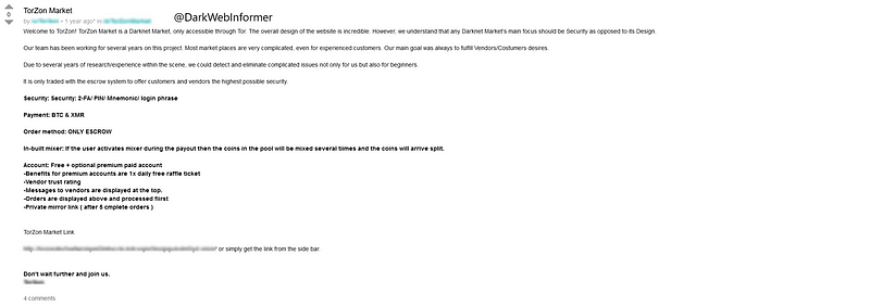 TorZon Market accepts BTC and XMR crypto. TorZon has been active since September 2022. Screenshots are below for TorZon market’s announcement on Dread.
