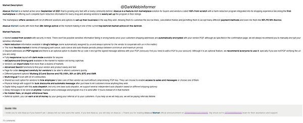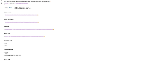 Abacus Market currently only accepts BTC and XMR crypto and has been active since September 2021. Below are screenshots of their announcement on Dread.