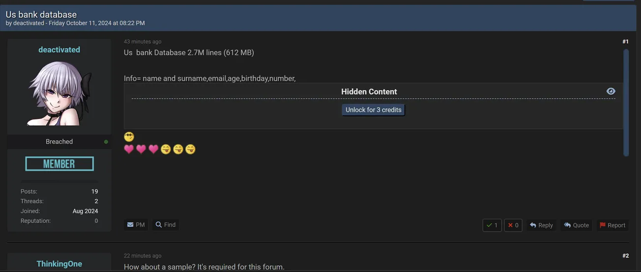 A Threat Actor Allegedly has Leaked Data from an Unidentified Bank in the USA