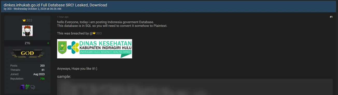 A Threat Actor Allegedly has Leaked the Database of Indragiri Hulu District Health Service
