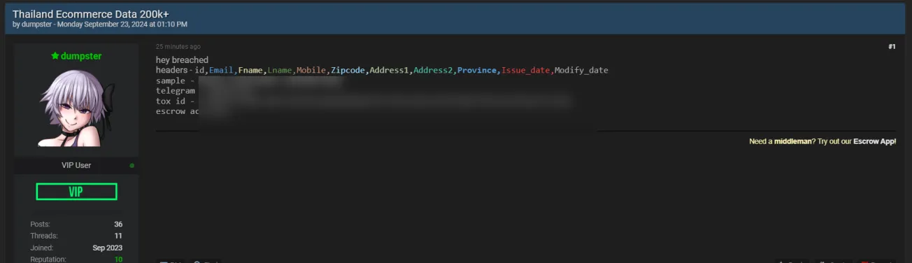 A Threat Actor Allegedly is Selling 200k+ Thailand Ecommerce Data