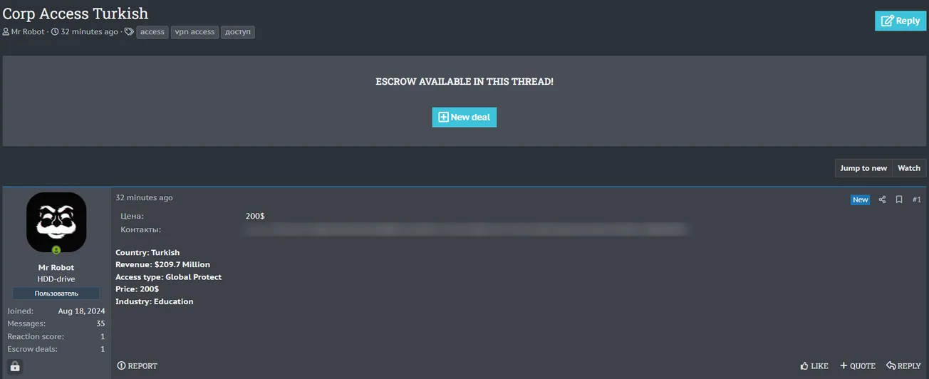 🚨 Title: Alleged sale of access to an unidentified Turkish organization