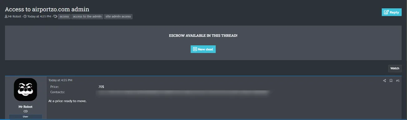 A Threat Actor Allegedly is Selling Admin Access to AirportZo