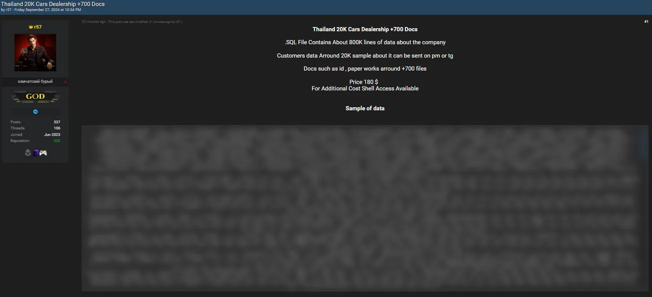 A Threat Actor Allegedly is Selling Data of an Unidentified Car Dealership Company in Thailand