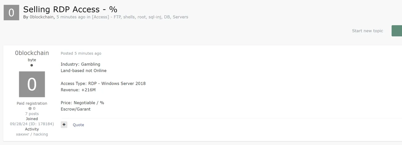 A Threat Actor Allegedly is Selling RDP Access of an Unidentified Gambling Company
