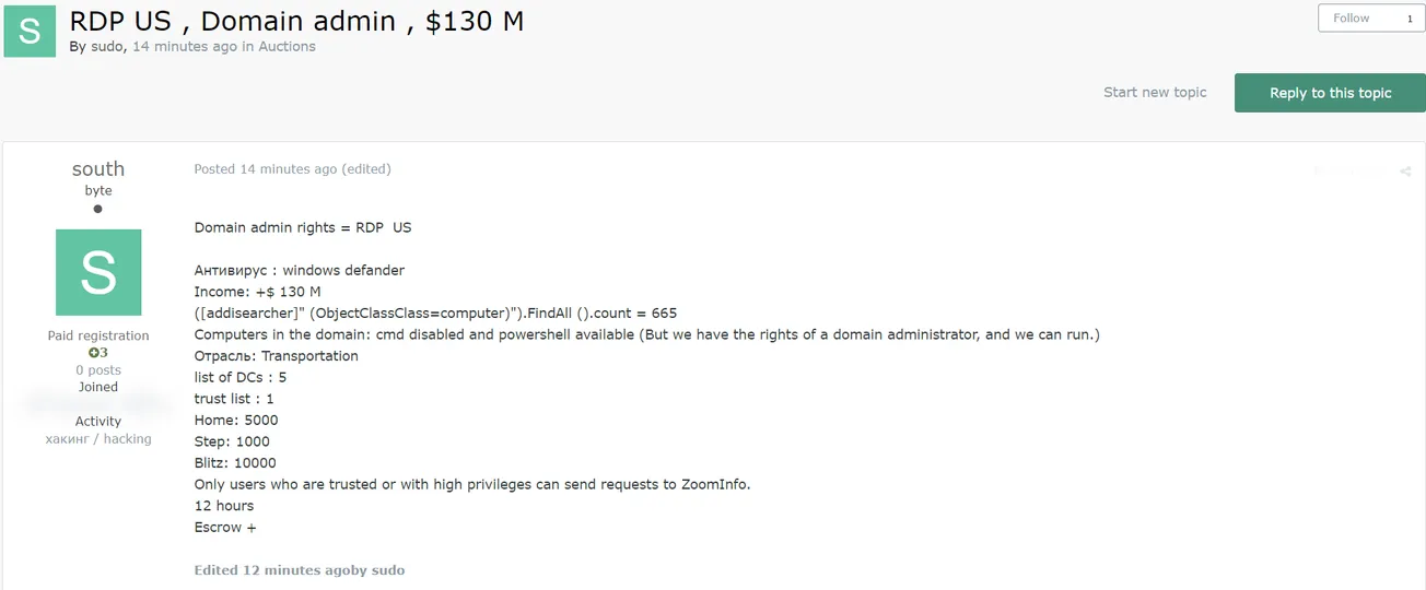 A Threat Actor Allegedly is Selling RDP Access to an Unidentified USA Company