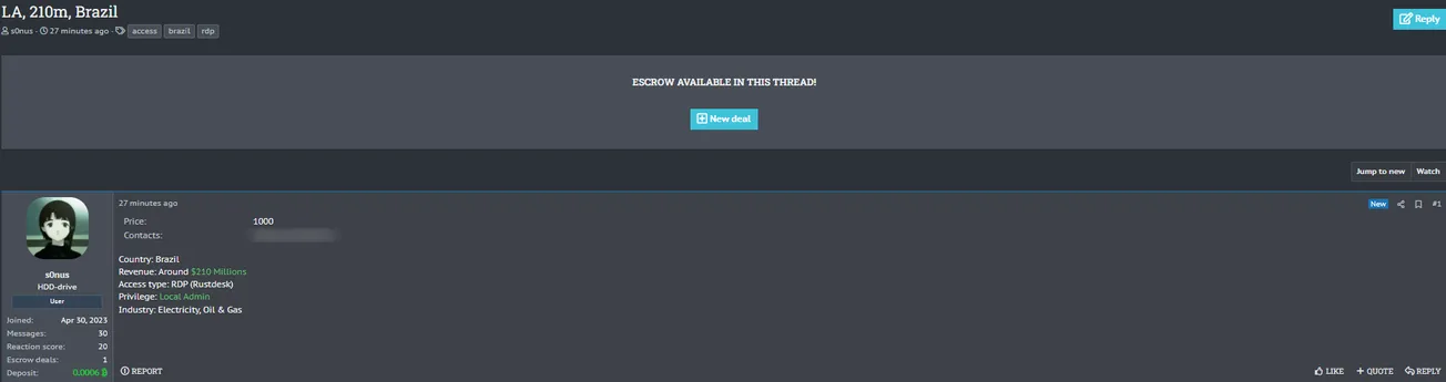A Threat Actor Allegedly is Selling RDP Admin Access to an Unidentified Brazilian Company
