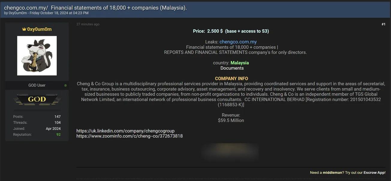 A Threat Actor Allegedly is Selling the Database of Cheng & Co Group