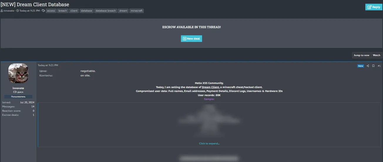 A Threat Actor Allegedly is Selling the Database of Dream Client