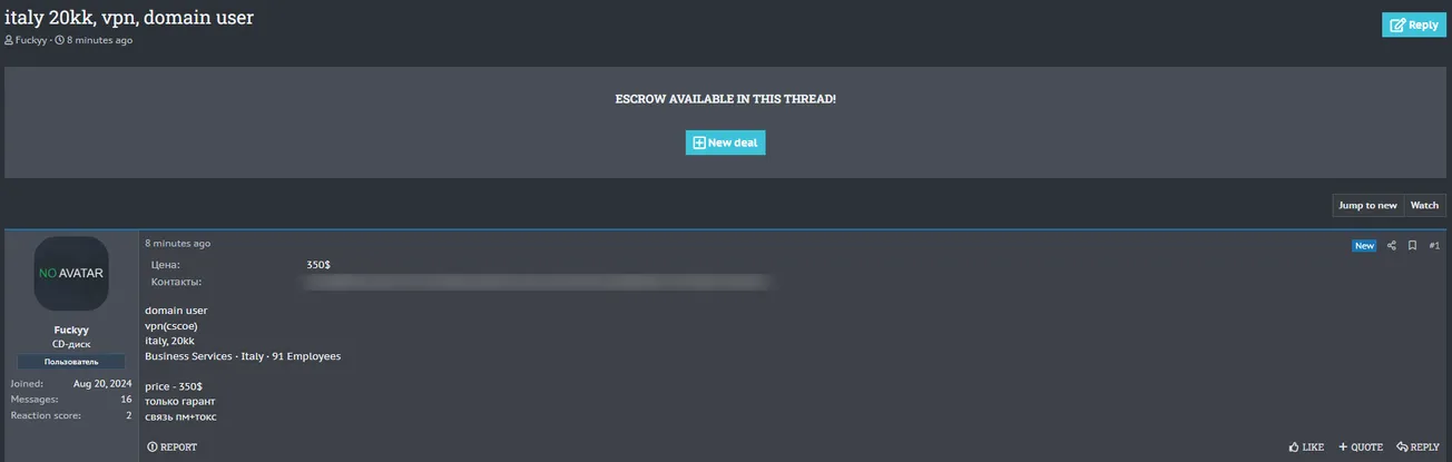 A Threat Actor Allegedly is Selling VPN Access to an Unidentified Italian Company