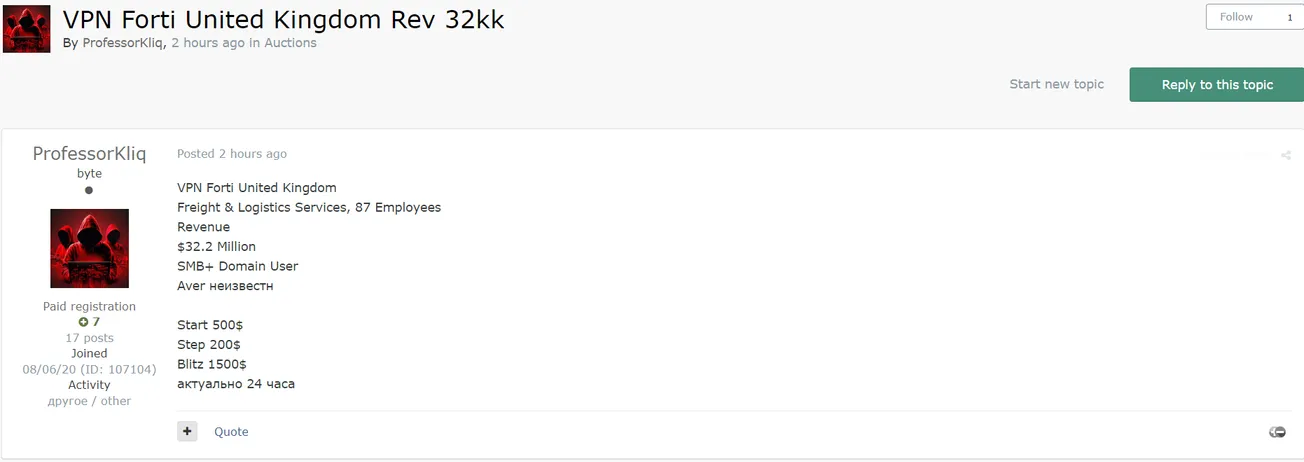 A threat Actor Allegedly is Selling VPN Access to an Unidentified UK Company