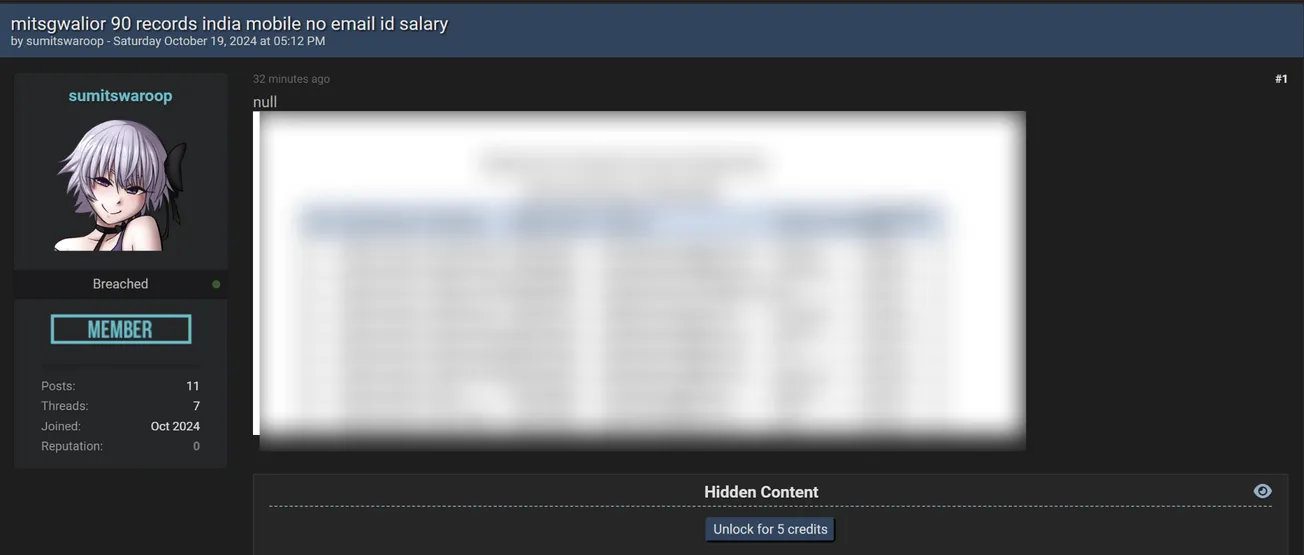 🚨 Title: Alleged data leak of Madhav Institute of Technology and Science (MITS)