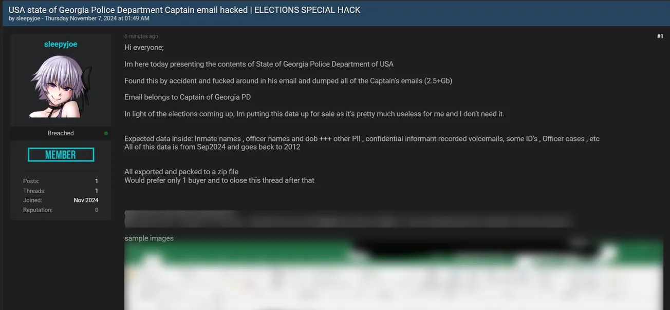 A Threat Actor Allegedly Leaked Data of Police Department Captain in the state of Georgia, USA