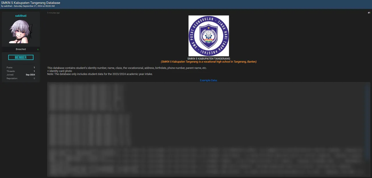 A Threat Actor Allegedly Leaked Data of SMKN 5 Kabupaten Tangerang