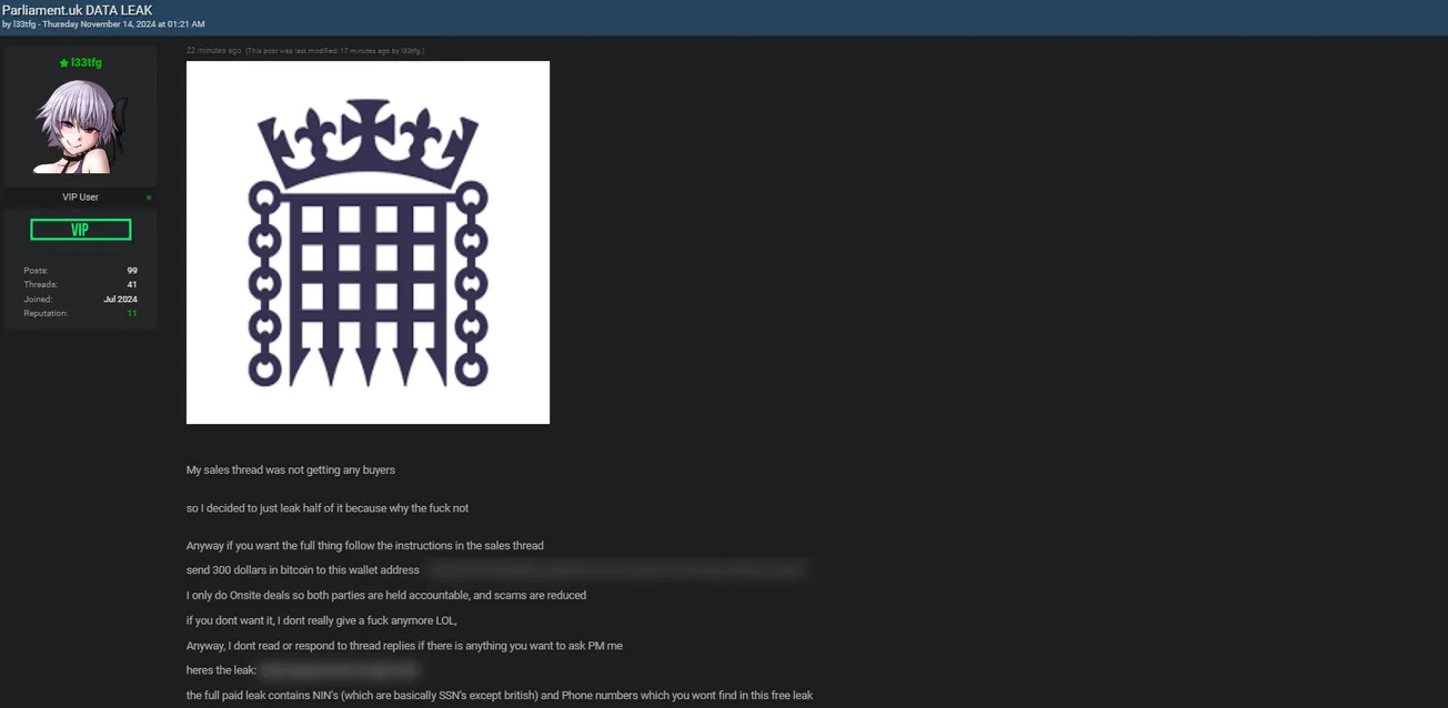 A Threat Actor Allegedly Leaked Data of the UK Parliament