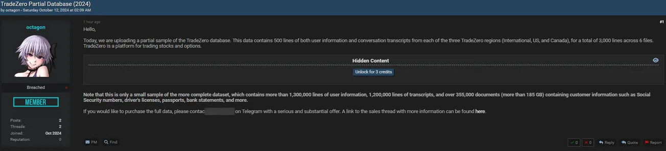 A Threat Actor Allegedly Leaked Data of TradeZero
