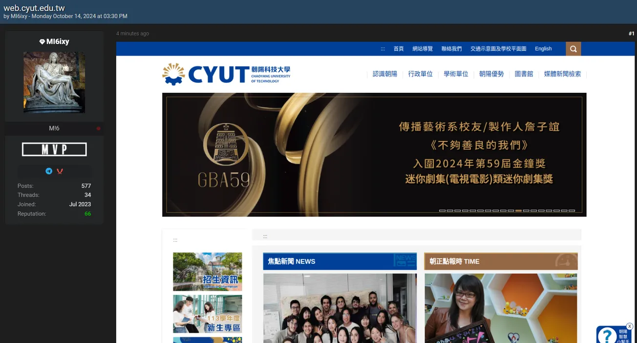A Threat Actor Allegedly Leaked the Chaoyang University of Technology Database