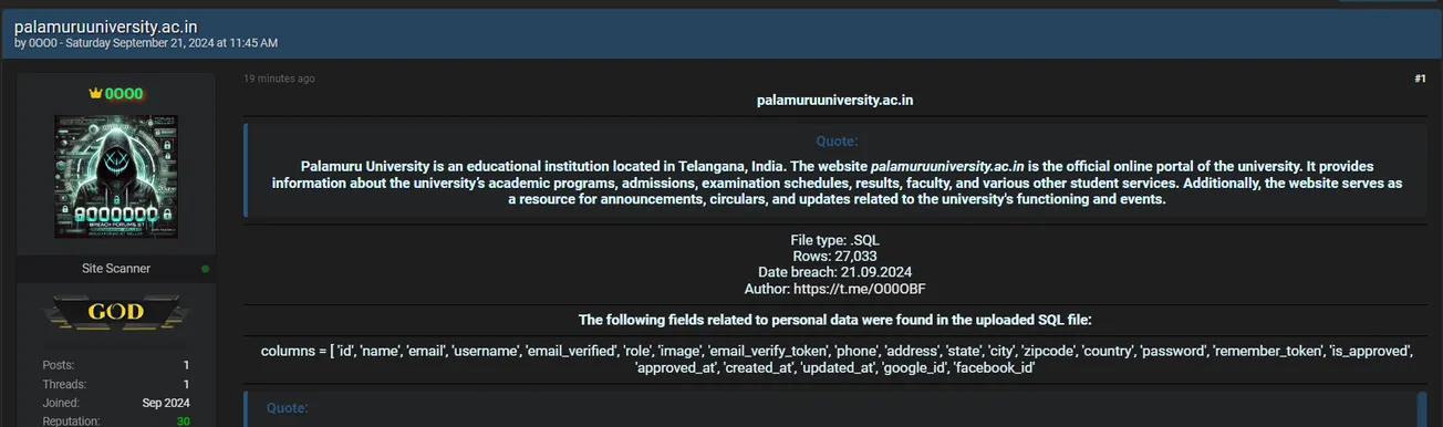 A Threat Actor Allegedly Leaked the Data of Palamuru University, Mahabubnagar
