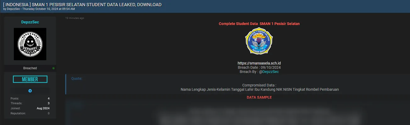 A Threat Actor Allegedly Leaked the Data of SMAN 1 PESISIR SELATAN