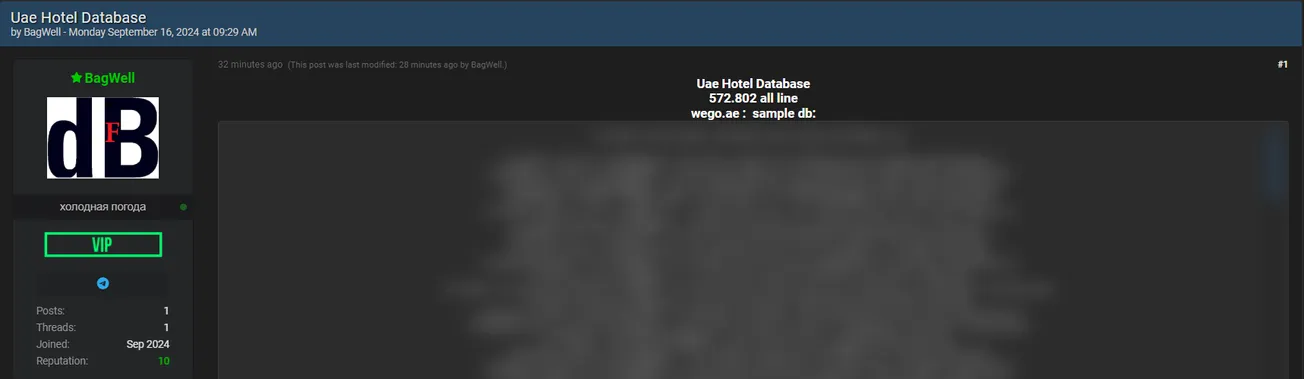 A Threat Actor Allegedly Leaked the Database of an Unidentified Hotel in the UAE