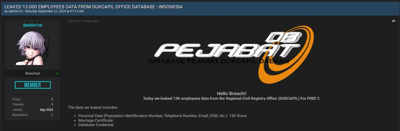 A Threat Actor Allegedly Leaked the Database of Dukcapil Online