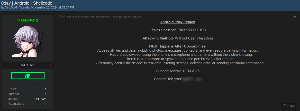 🚨 Title: Alleged sale of 0day Exploit for Android