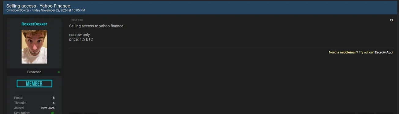 A Threat Actor Claims to be Selling Access to Yahoo Finance for 1.5 BTC