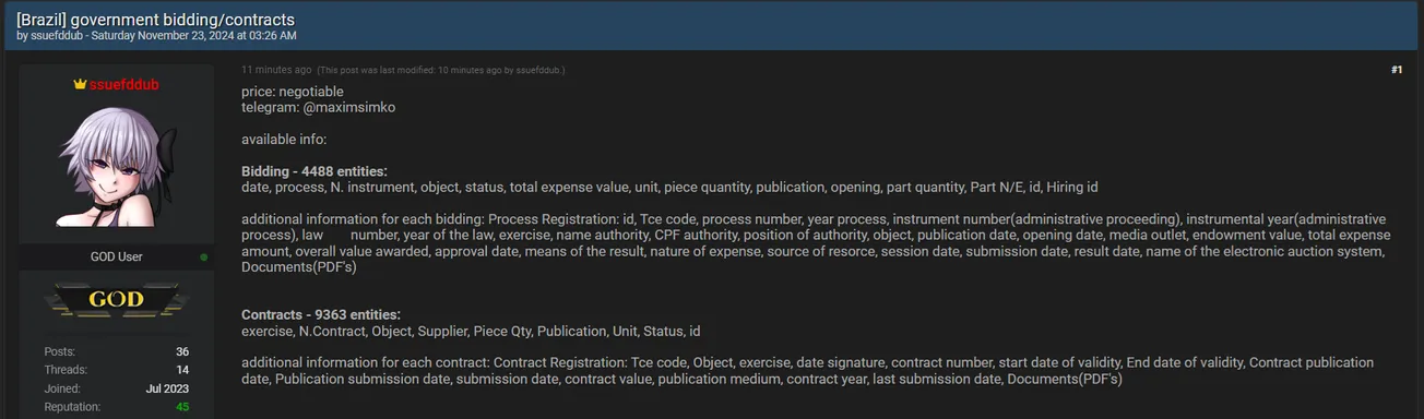 🚨 Title: Alleged Data Sale of an Unidentified Brazil government bidding/contracts