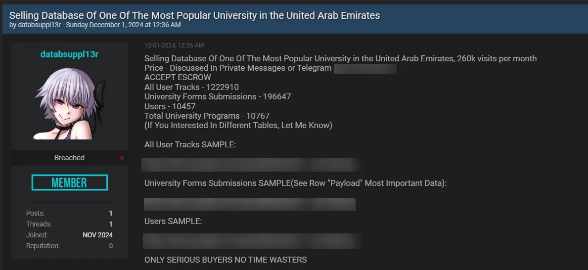 A Threat Actor Claims to be Selling the Data of an Unidentified University in UAE