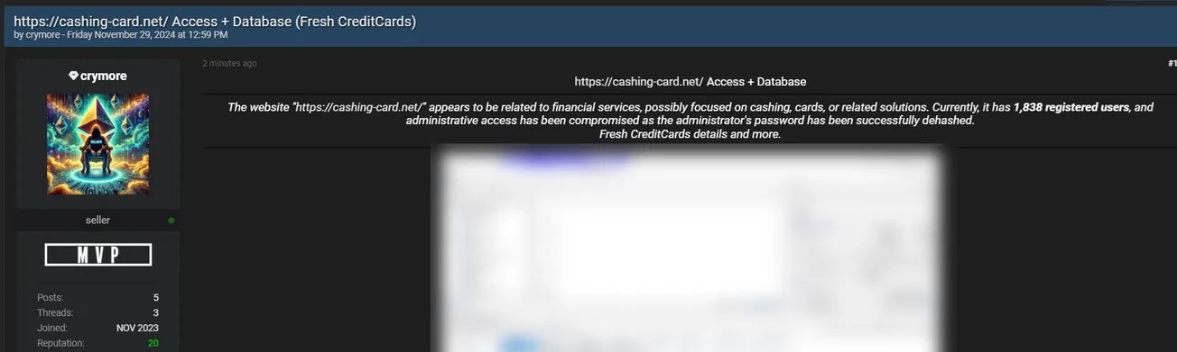 A Threat Actor Claims to be Selling the Data of Cashing-Card