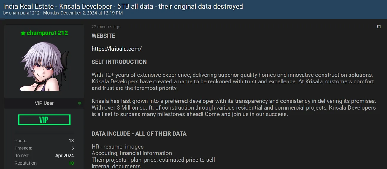 A Threat Actor Claims to be Selling the Data of Krisala Developers
