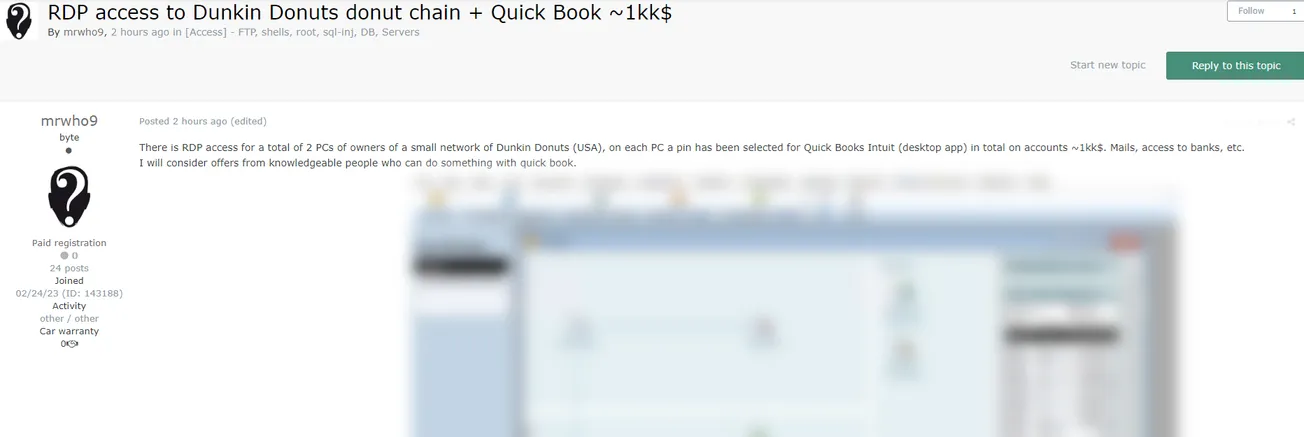 🚨 Title: Alleged sale of RDP access to Dunkin' Donuts