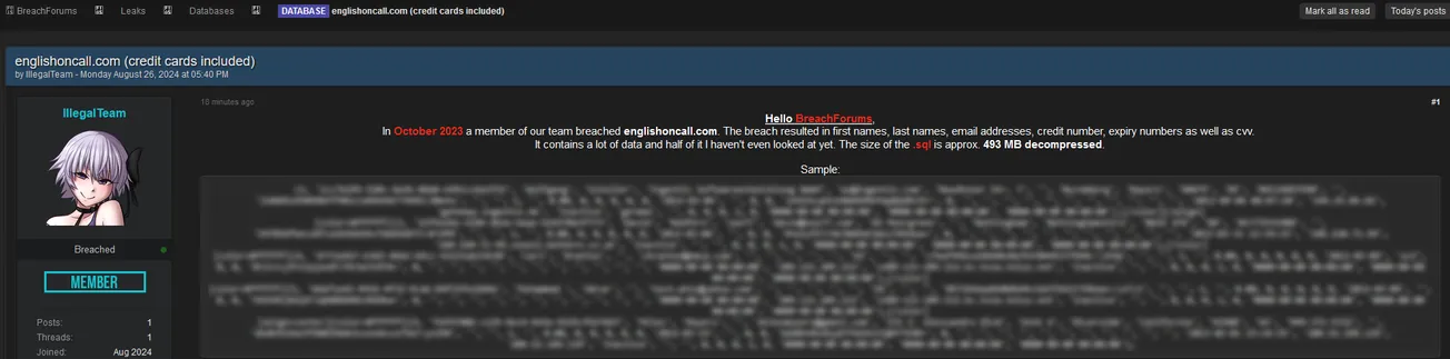 In October 2023, a member of our team breached englishoncall.com. The breach resulted in the exposure of first names, last names, email addresses, credit card numbers, expiry dates, and CVV codes.