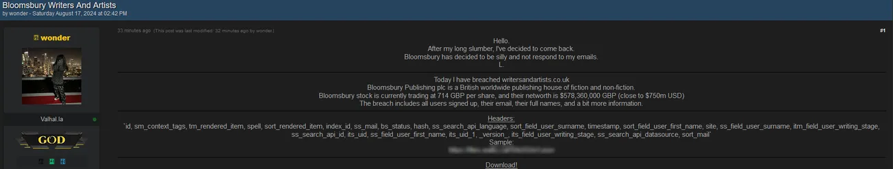 A Threat Actor Has Allegedly Leaked Data Belonging to Bloomsbury Writers and Artists