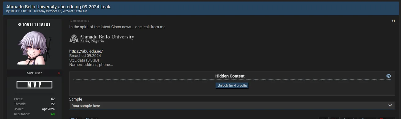 A Threat Actor has Allegedly Leaked Data of Ahmadu Bello University