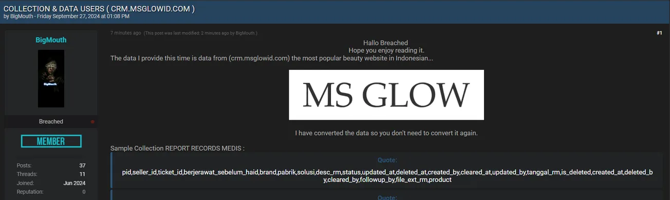 A Threat Actor has Allegedly Leaked Data of MS GLOW Beauty