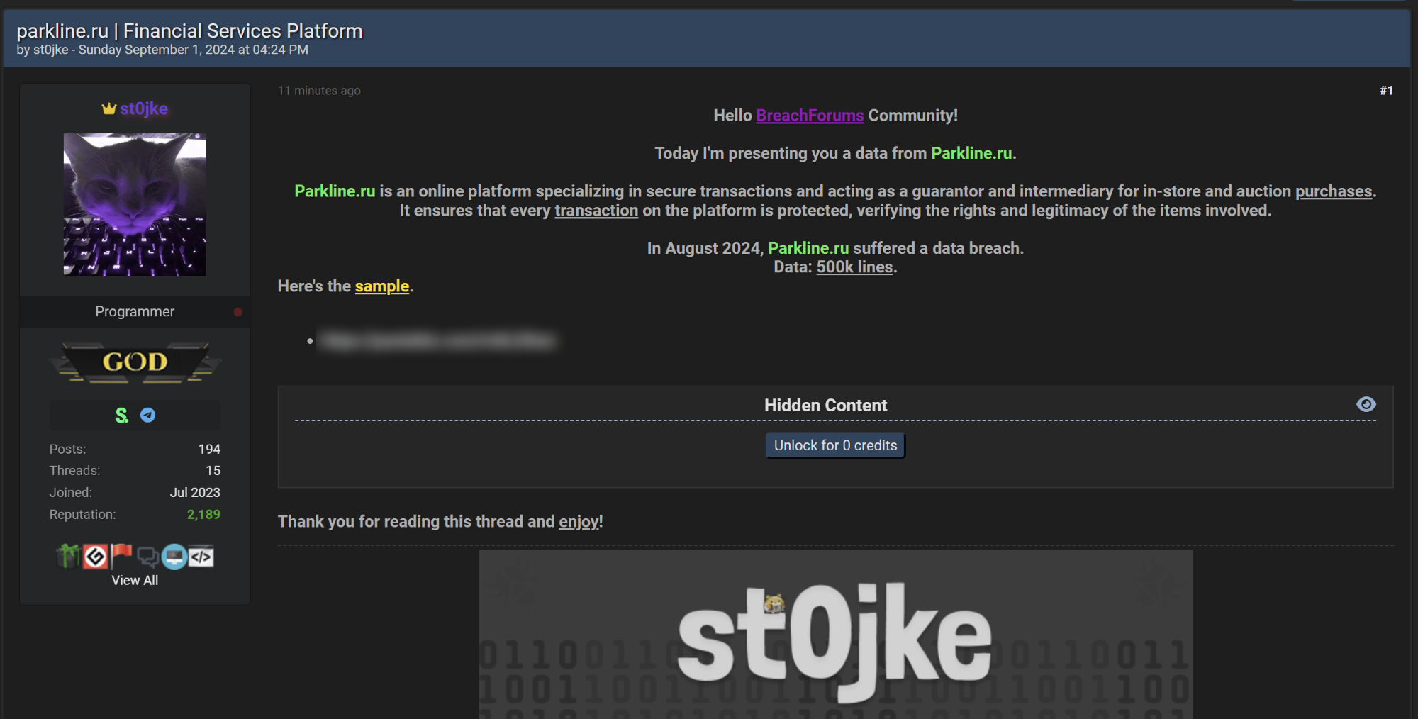 In August 2024, Parkline.ru suffered a data breach.