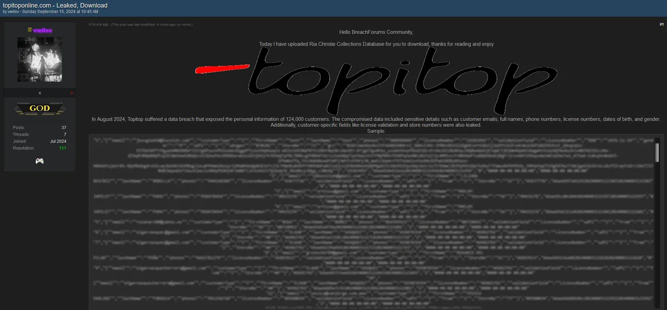 🚨A Threat Actor has Allegedly Leaked Data of Topitop
