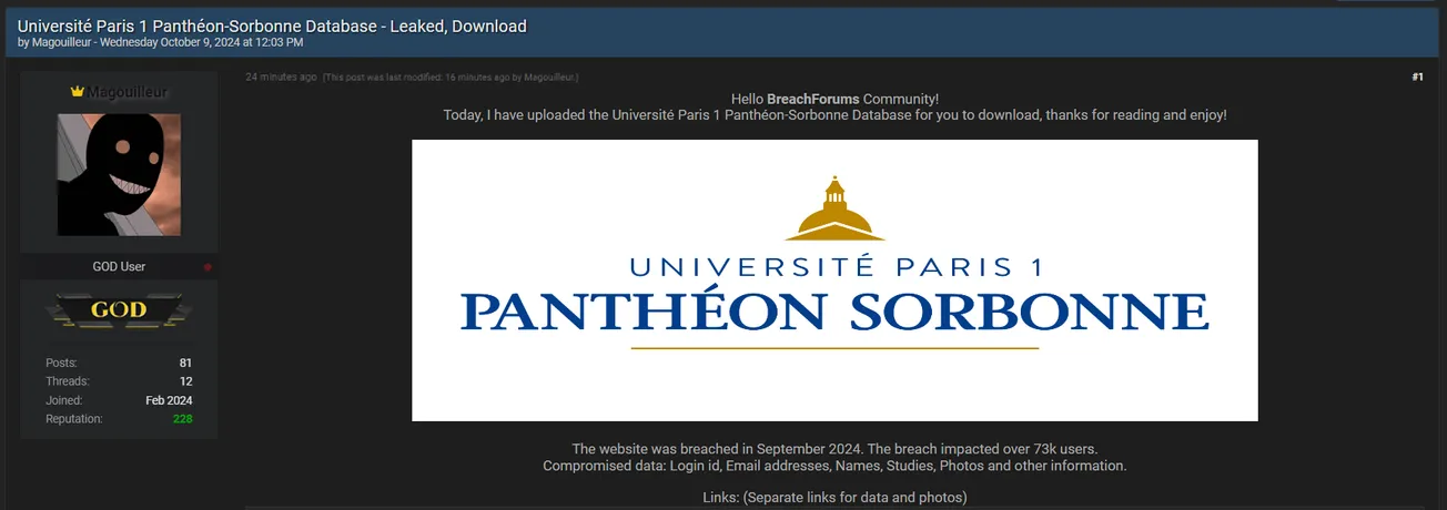 🚨 Title: Alleged database leak of University of Paris I: Panthéon-Sorbonne