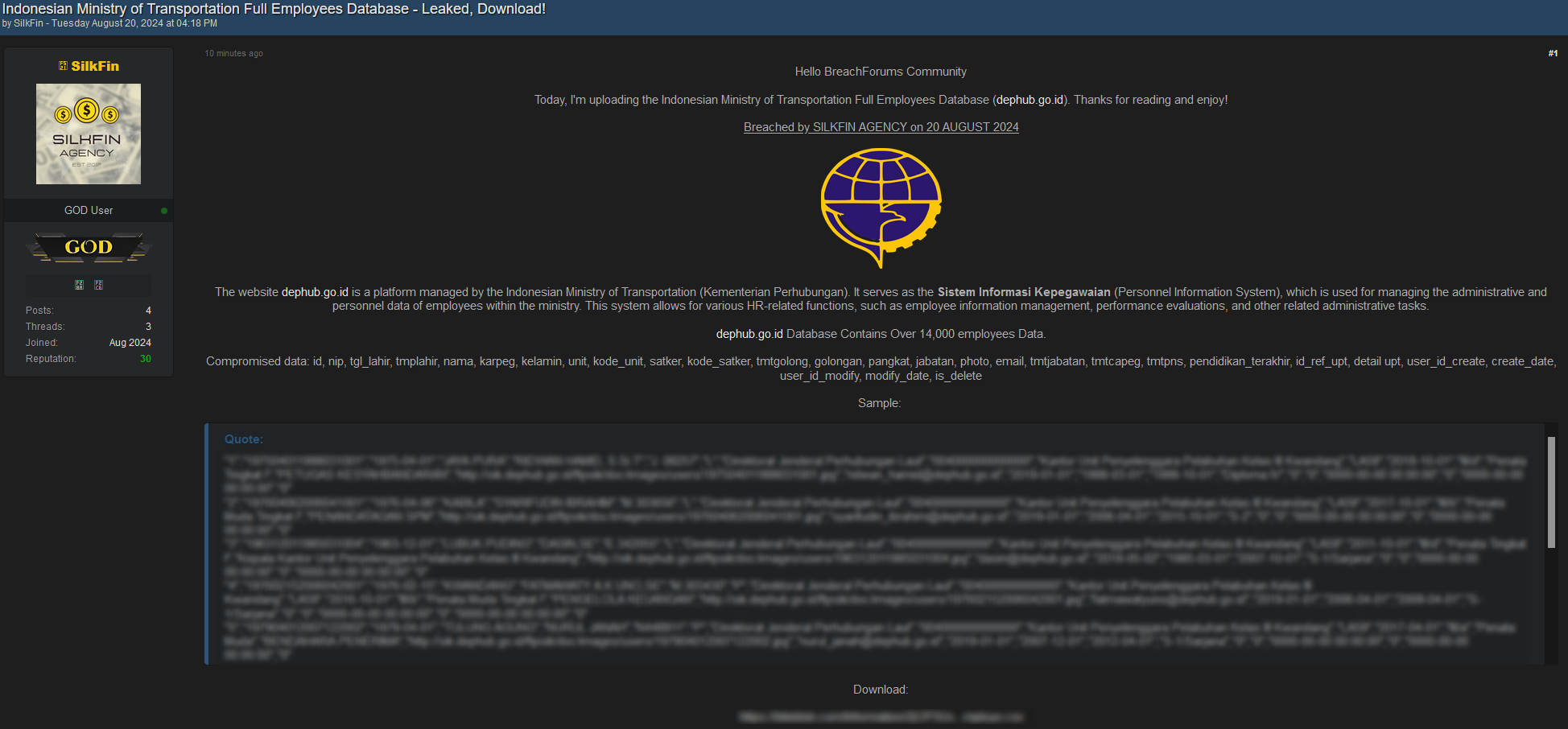 dephub.go.id Database Contains Over 14,000 Employees Data.