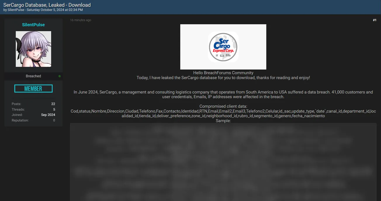 A Threat Actor has Allegedly Leaked SerCargo Express Database