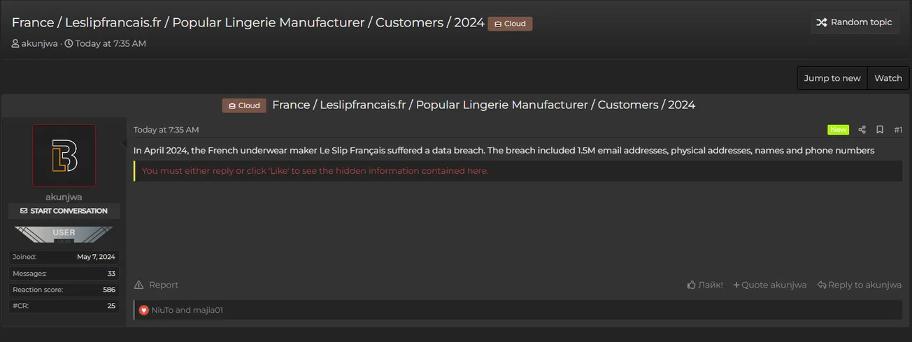 A Threat Actor has Allegedly Leaked the Database of Le Slip Français